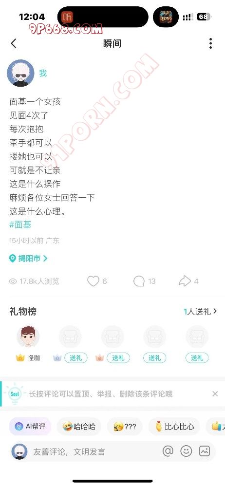 6建议:soul的动态最好跟你自身价值差不多,不要盲目用网图展示自己的高逼格生活,不然就算展示出来你的生活很牛逼,女生也不傻,真的跟女生见面时容易翻车。