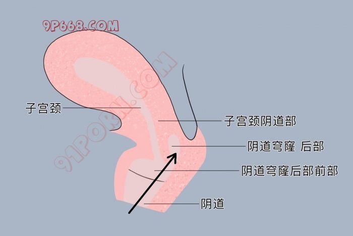 已经插入的方向,从女性的生理结构来说,不会插进宫颈,只会插进阴道穹窿后部分,如图所示。