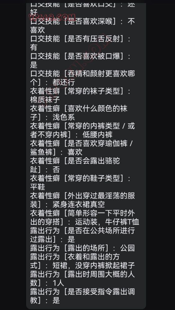 基本信息[年龄]: 基本信息[身高]: 基本信息[体重]: 基本信息[三围/罩杯]: 基本信息[职业]: 基本信息[学历]: 基本信息[地址]: 基本信息[情感状态]: 基本信息[禁忌]: 基本信息[喜欢被怎么称呼]: 性经验[破处年龄]: 性经验[破处跟谁]: 性经验[三洞被开发的程度]: 性经验[被多少人艹过]: 性经验[艹你的人和你是什么关系]: 性经验[是否多 P 过,几人]: 性经验[最喜欢的姿势]: 性经验[最喜欢被射的部位]: 性经验[做爱频次]: 性经验[自慰频次]: 性经验[有没有给对象带过绿帽]: 性经验[有什么刺激的经历]: 性经验[有什么想做而还没做的事]: 性经验[自我评价]: 口交技能[是否喜欢口交]: 口交技能[是否喜欢深喉]: 口交技能[是否有压舌反射]: 口交技能[是否喜欢被口爆]: 口交技能[吞精和颜射更喜欢哪个]: 衣着性癖[常穿的袜子类型]: 衣着性癖[喜欢什么颜色的袜子]: 衣着性癖[常穿的内裤类型/或者不穿内裤]: 衣着性癖[是否喜欢穿瑜伽裤/鲨鱼裤]: 衣着性癖[是否会露出骆驼趾]: 衣着性癖[常穿的鞋子类型]: 衣着性癖[外出穿过最淫荡的服装]: 衣着性癖[简单形容一下平时外出的穿搭]: 露出行为[是否在公共场所进行过露出]: 露出行为[露出的场所]: 露出行为[衣着和露出的方式]: 露出行为[露出时周围大概的人数]: 露出行为[是否接受指令露出调教]: 欢迎投稿